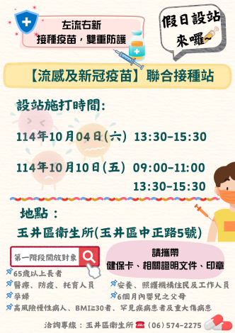 阿公阿嬤~爸爸媽媽~玉井區衛生所 來接你打針囉~來囉來囉~💪棒!好棒! 流感疫苗保護你健康!讚!好讚! 新冠疫苗讓你不害怕!哇賽哇賽, 雙重防護身體壯!哇賽哇賽, 假日設站服務讚!掰掰~打完回家囉~😄