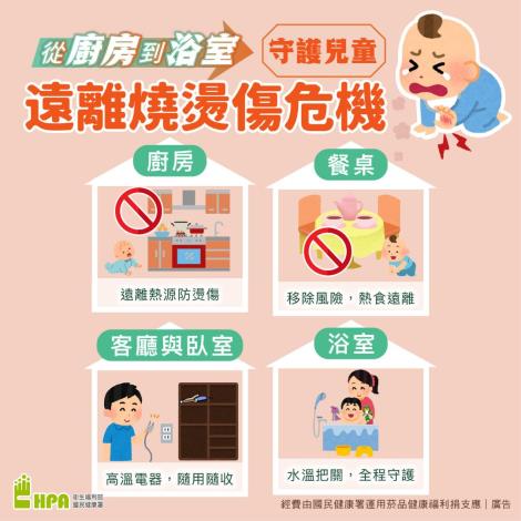 廚房與幼童的活動空間確實區分,並保持廚房地面乾燥、止滑及養成將鍋具手柄朝內擺放的習慣