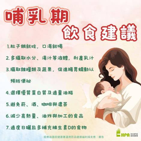 一般而言,哺乳期間 蛋白質 等 六大營養素 及水分、維生素、礦物質都需均衡攝食。哺乳期間也建議多補充不同顏色的蔬果,達到均衡飲食。