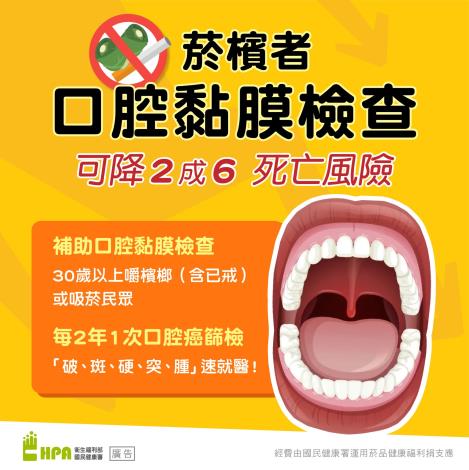 國民健康署有效運用菸品健康福利捐,補助30歲以上嚼檳榔(含已戒檳榔)或吸菸民眾,(嚼檳榔包含已戒之原住民可提前至18歲起接受檢查),每2年1次口腔黏膜檢查,早期發現早期治療,進而降低癌症的發生和死亡。
