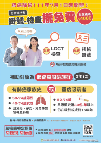 肺癌篩檢是目前提供的四癌篩檢之外(子宮頸癌、乳癌、口腔癌、大腸癌),依據國際實證及國內研究結果,並經專家及相關學會討論訂定的癌症篩檢政策,而推出的第五癌篩檢。請符合資格之民眾洽詢參與本計畫之辦理醫院,踴躍篩檢,早期診斷,早期治療。